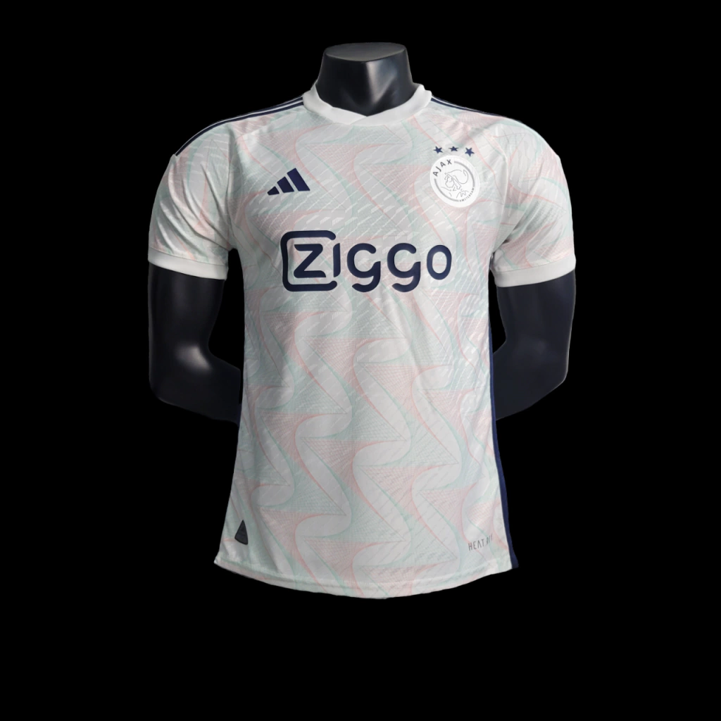 A nova camisa reserva do Ajax para a temporada 2023/24 é predominantemente branca e traz um padrão gráfico no corpo, em forma de ondas, inspirado na arquitetura de Amsterdã, com gradiente em turquesa e rosa.