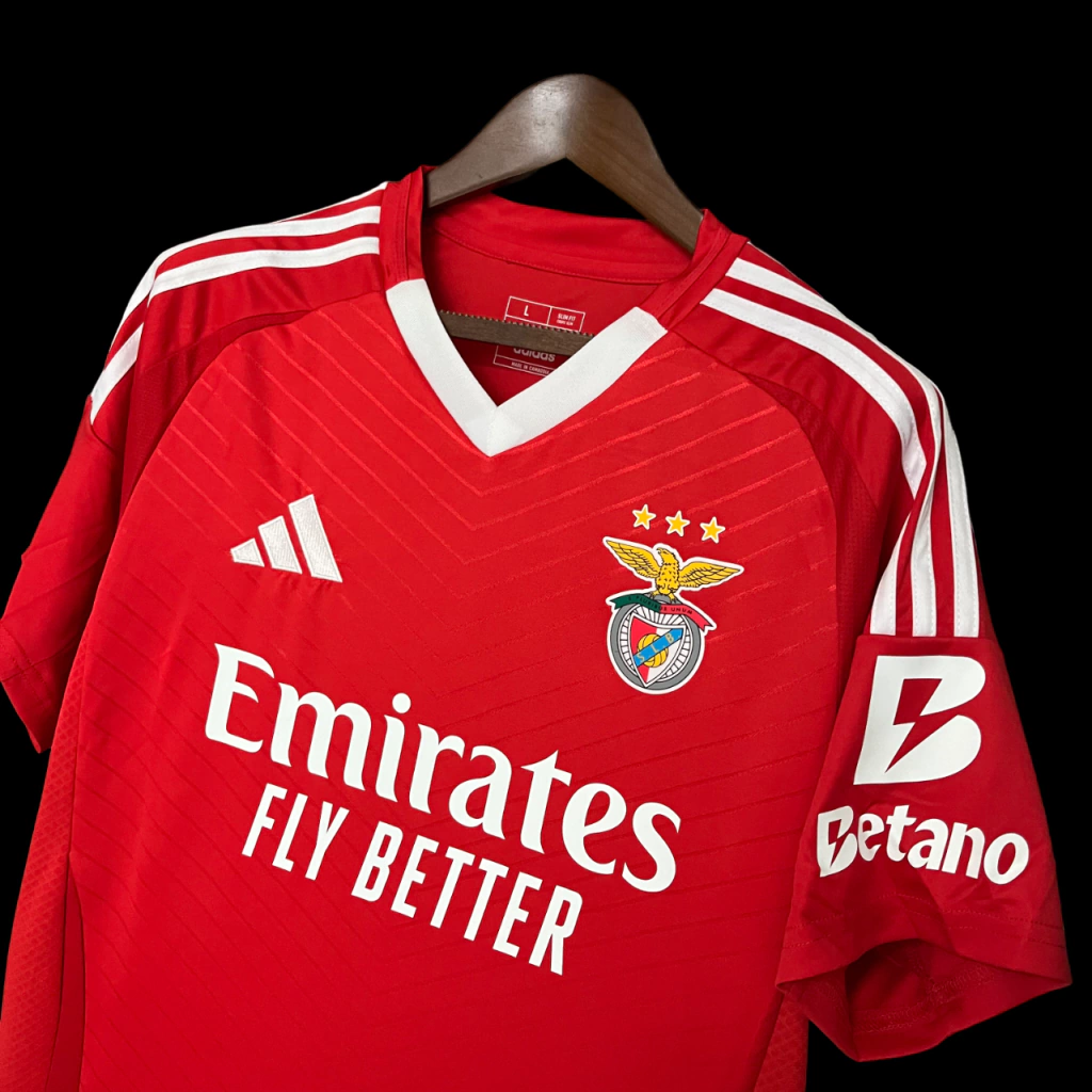 A nova camisa titular do Benfica traz a cor vermelha encarnada e tem diversos chevrons em embossing, visto sobre toda a parte frontal do kit.