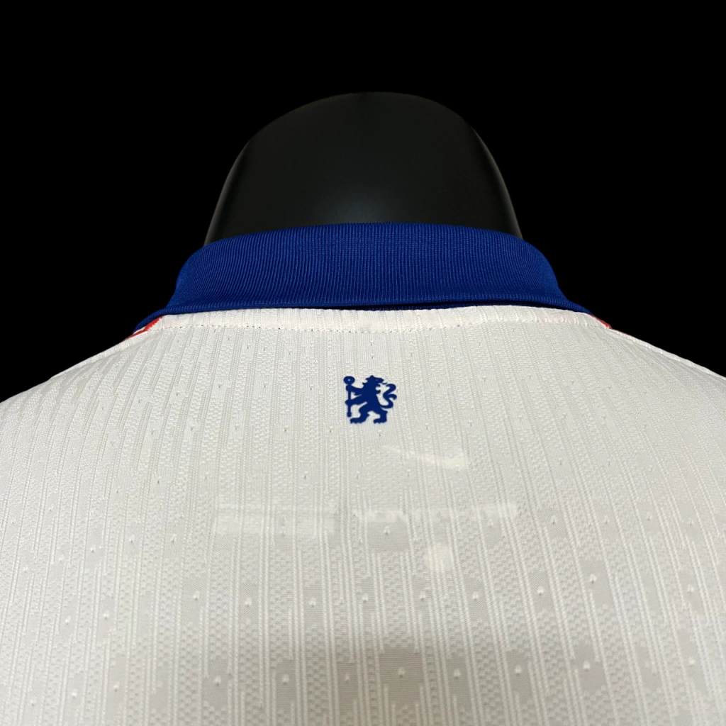 A nova camisa reserva do Chelsea para a temporada 2024/25 possui um tom de bege como cor predominante, com detalhes laranja.