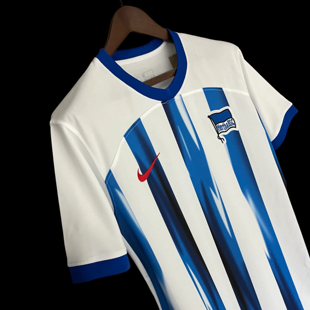A nova camisa titular do Hertha Berlin para a temporada traz o tradicional listrado em azul sobre a base branca, e desta vez com um design diferenciado.