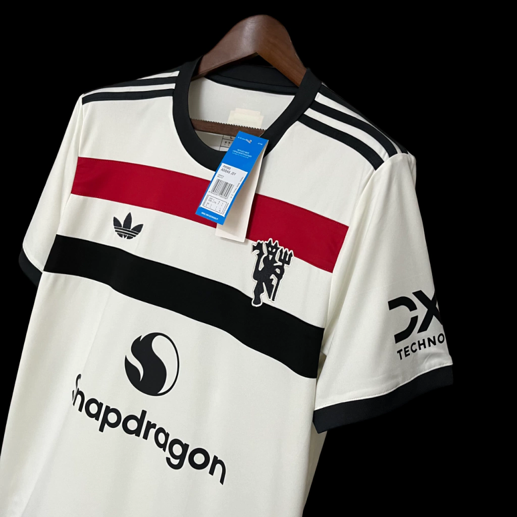 O novo manto três do Manchester United é off-white e traz faixas horizontais vermelhas e pretas no peito, formando o desenho da bandeira tricolor, levada pelos torcedores aos jogos.