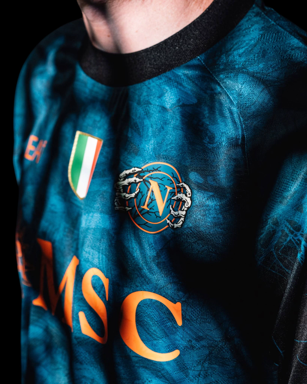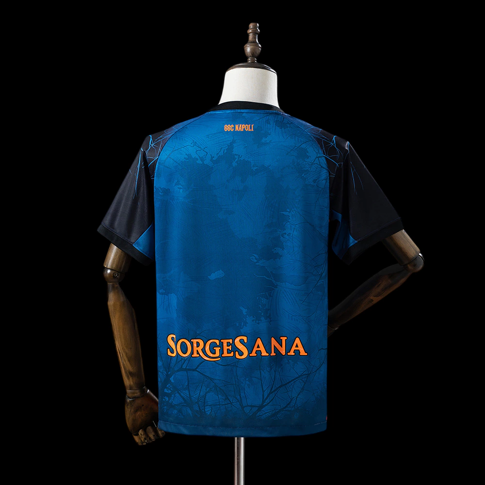 A nova camisa especial de Haloween da Napoli é azul petróleo e traz no corpo, na região frontal, um grafismo de esqueleto.