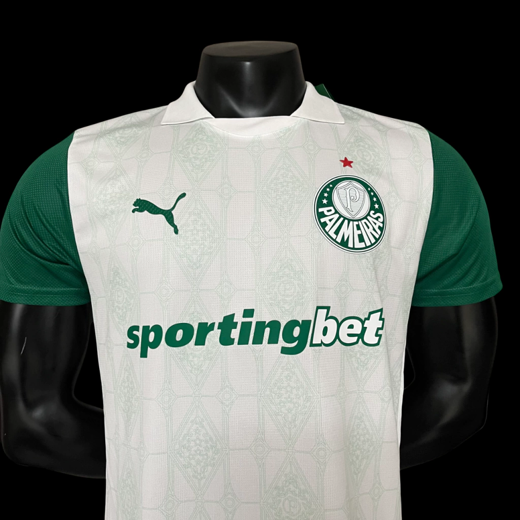 A camisa reserva do Palmeiras, por sua vez, é branca e também traz a estampa em jacquard ao longo do corpo do manto.