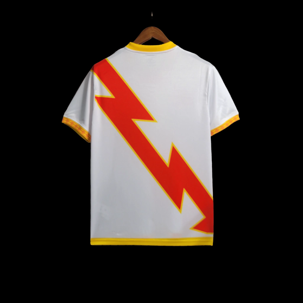 A camisa titular do Rayo Vallecano para a temporada traz a base branca com o raio vermelho cortando o kit da esquerda para a direita, desta vez com bordas douradas.