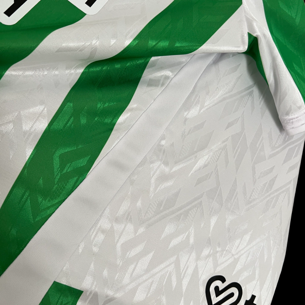 A camisa titular do Real Bétis traz o tradicional listrado vertical em verde e branco, que continuam nas mangas. O tecido traz um padrão brilhante da marca, que tem sido utilizado nesta temporada para lembrar os anos 90.