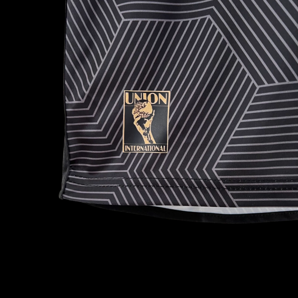 A nova camisa alternativa do Union Berlin tem a cor preta como predominante e traz no corpo um padrão gráfico bastante utilizado pela marca, com hexágonos formados por linhas cinzas.