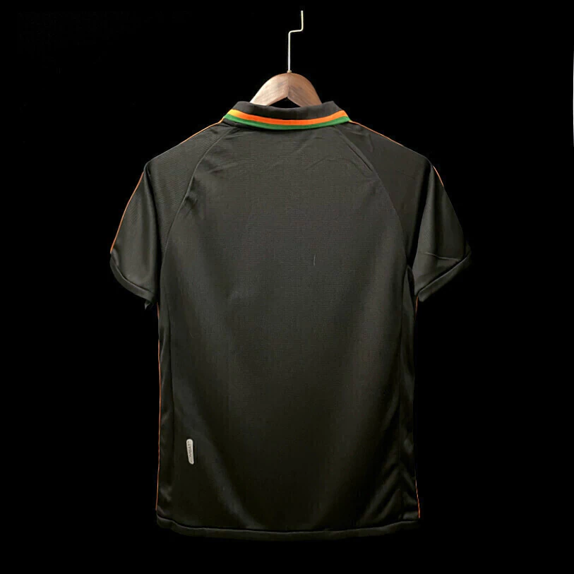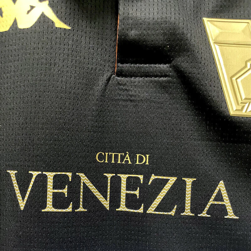 A camisa titular do Venezia para a temporada 2022/23 é predominantemente preta, em um estilo bastante clássico com gola polo preta, com bordas em verde e laranja, que também é visto na parte interna do botão.