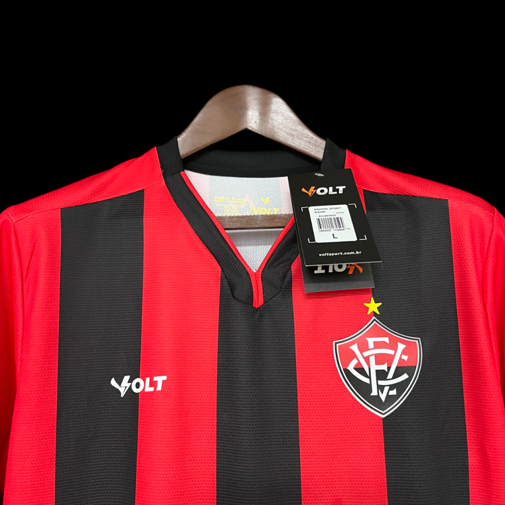 A camisa titular do EC Vitória tem novamente as faixas verticais rubro-negras, sendo o vermelho a cor de fundo com três listras pretas sobre ela e duas laterais.